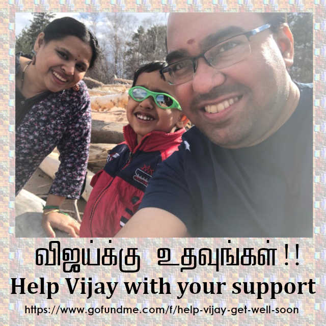 நான்கு மாதங்களாக மருத்துவமனையில் போராடிக்கொண்டிருக்கும் விஜய்க்கும், நிலைகுலைந்திருக்கும் அவருடைய குடும்பத்திற்கும் நம்முடைய உதவியும், பிரார்த்தனையும் தேவைப்படுகிறது. நமது உதவி அவர்களுக்கு மனதளவில் ஒரு ஆறுதலாக அமையும். சொந்தங்கள் அருகில் இல்லை என்ற குறையின்றி, துணை நிற்க மக்கள் உண்டு என்று சொல்லும் விதமாக, நம்மால் இயன்ற உதவியைச் செய்திடுவோம். நம்முடைய நண்பர்களுக்கும் இச்செய்தியைப் பகிர்ந்திடுவோம்.